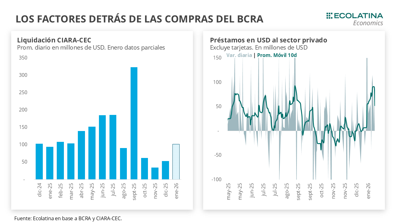 Volviendo, detrás de las compras recientes se encuentra una mayor oferta de divisas comerciales y financieras. Por un lado, comenzó a acelerar la liquidación del sector agropecuario, con un ritmo que se ubicaría por encima de los USD 100 M a partir de enero (vs USD 53 M en dic-25 y USD 35 M nov-25). Ligado a esto, los préstamos al sector privado en dólares (excluyendo préstamos por Tarjetas) subieron USD 985 M en lo que va del mes (20-ene último dato disponible) y cortaron una racha de tres meses consecutivos a la baja, implicando un ritmo promedio diario de USD 75 M. Asimismo, la emisión de Obligaciones Negociables en USD continuó a paso firme, con una colocación cercana a los USD 1.200 M en los últimos diez días. Respecto a esto, en la mencionada presentación el Central muestra que desde oct-24 hasta el 14-ene-25 se emitieron USD 6,4 bn, pero sólo se liquidaron USD 2,8 bn en el mercado, quedando un remanente de USD 3,6 bn a liquidarse (aunque USD 1,3 bn iría destinado al pago de vencimientos de deuda).