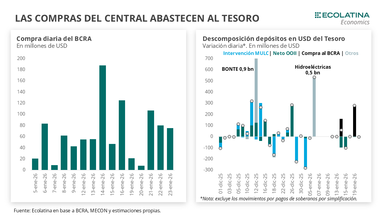 Al respecto, el Tesoro compró dólares al BCRA. Una de las dudas del relanzamiento del programa era la postura que tomaría Hacienda, que se encontraba vendiendo divisas en las últimas ruedas de diciembre y comienzos de enero. En concreto, desde que el Central inició las compras el Tesoro se movió del mercado y, en su lugar, comenzó a comprar divisas al BCRA: el 7-ene le compró USD 2.319 M para el pago de cupones; y el 14-ene y 20-ene otros USD 158 M y USD 279 M, respectivamente, de cara a vencimientos con Organismos Internacionales por USD 100 M el jueves pasado y otros USD 100 M que vencerán la próxima semana.